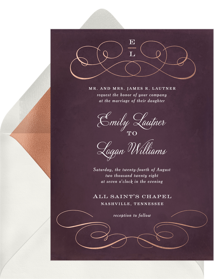 Rose Gold Flourish Invitations In Purple Greenvelope Com